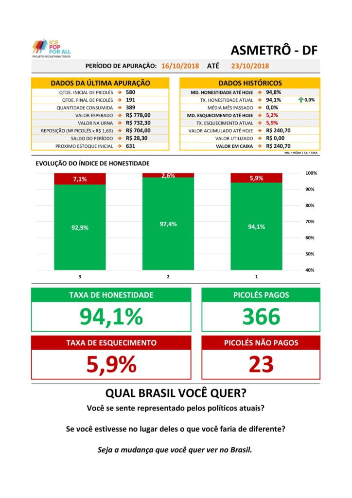 No período de 16 a 23 de outubro foram vendidos 389 picolés e destes, 23 não foram pagos. O índice de honestidade variou negativamente em 3,3%, aumentando o índice de esquecimento que passou de 2,6% para 5,9%. A próxima conferência acontecerá no dia 30 de outubro. Seguimos confiante em atingir 100% de honestidade no projeto Ice Pop For All.