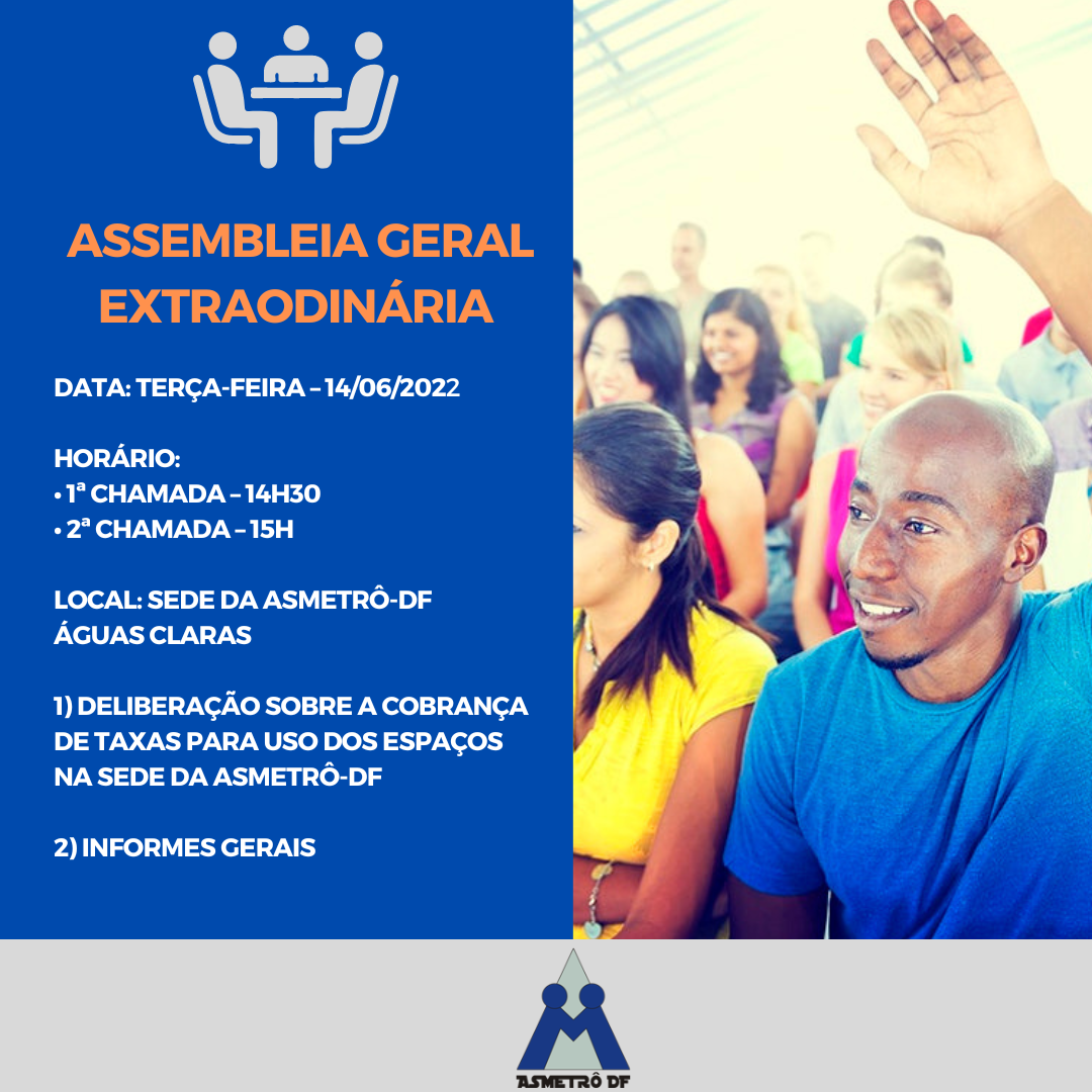 O Presidente da ASMETRÔ-DF convoca todos os Associados e Associadas em caráter extraordinário, com a finalidade de deliberação sobre a implantação de taxa de utilização dos espaços comuns da sede da associação, para fins de custeio dos serviços de manutenção e limpeza dos locais e informes gerais, em primeira convocação com a presença de titulares prevista em estatuto, no dia 14/06/2022 (terça-feira), às 14h30 e, em segunda convocação, com qualquer número de associados, às 15h, na sede social da ASMETRÔ-DF (Avenida Jequitibá, 155, Águas Claras, Brasília-DF).