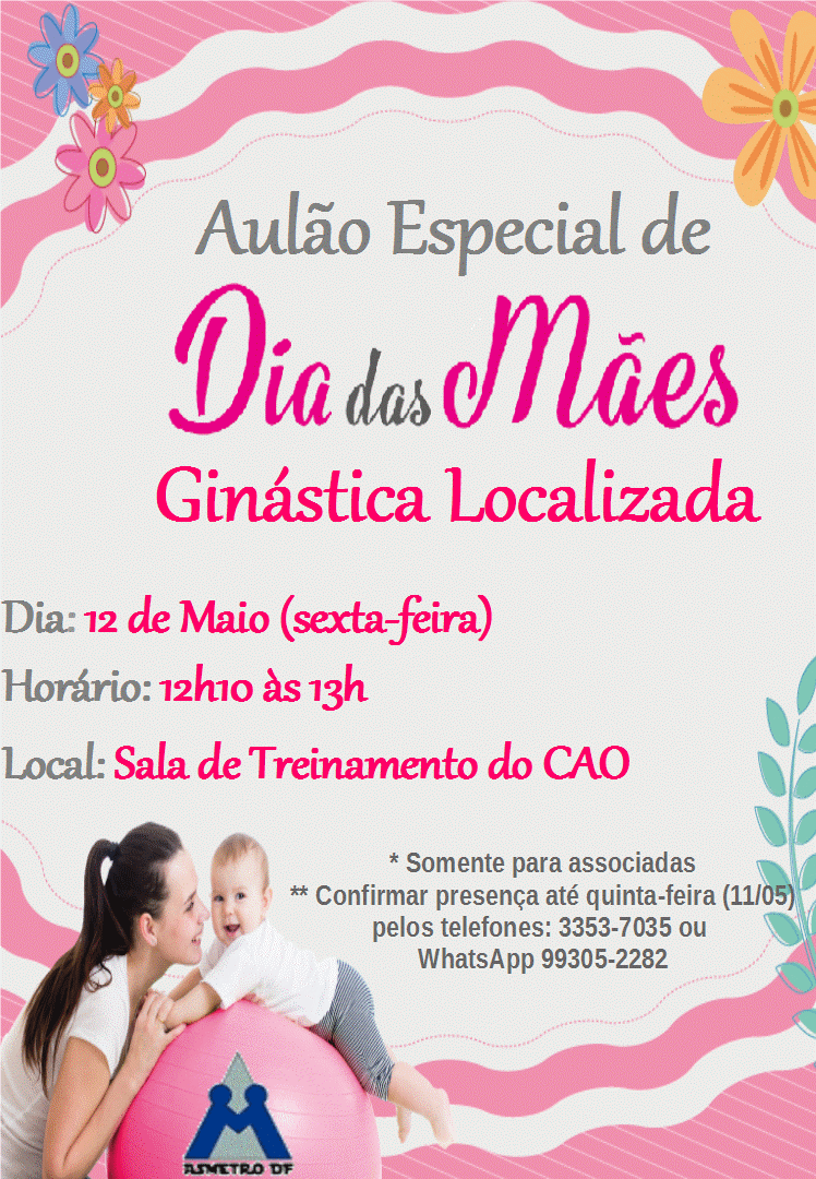 10 maio 2017 Aulão Especial de Dia das Mães – Ginástica Localizada por Uelder Cleber de Melo Silva | postado em: Todas as Notícias | 0 Em comemoração ao dia das mães, a Asmetrô realizará um Aulão Especial de Ginástica Localizada para as associadas! Será nesta sexta-feira (12/05), das 12h10 às 13h, na Sala de Treinamento do CAO. Participe! FacebookFacebookXX