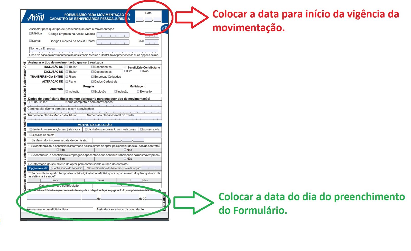 Obs. No formulário “Movimentação de beneficiário – Plano de Saúde” existem campos para datas que devem ser preenchidos: