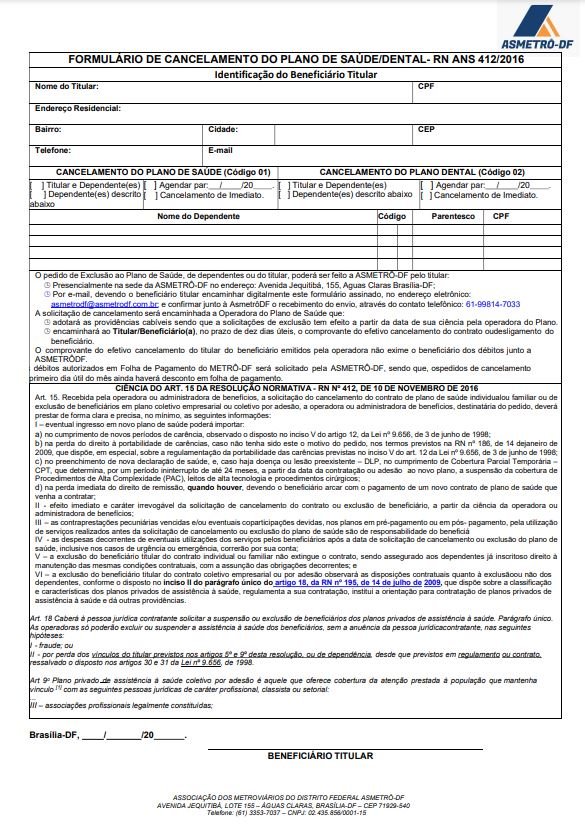FORMULÁRIO DE CANCELAMENTO DO PLANO DE SAÚDE/DENTAL